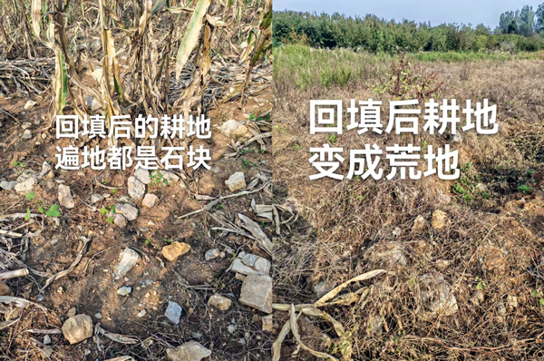 村民石某伟说,2016年村北名为十二亩地的地块施工开挖污水管道,占用了他的3亩耕地,施工完成后土地回填不合格,满地都是大大小小的石头,地面比两边洼很多,雨后形成水洼,原本肥沃的耕地至今无法耕种庄稼,遭遇同种情况的还有季某忠、孙某东等其他村民。孙某东他们多次到污水管道的主管部门蒙阴县生态环境局反映,他们竟答复称村支书姚某学同意,验收合格!实际上村民毫不知情,地块也无法耕种。为什么铺设管道填埋后反而低于原来的土地呢?村民称是部分熟土被卖了,导致回填后地块低洼存水。2024年,生态环境局承诺按每亩地每年600元再给予补偿3年(2022年-2024年),但是村民们至今没有收到这笔补偿款,生态环境局说款拨到了镇里,镇里叫向村里要,村书记姚某学说这笔钱让镇里给挪用了,就这样踢来踢去,把补偿款给踢没了。