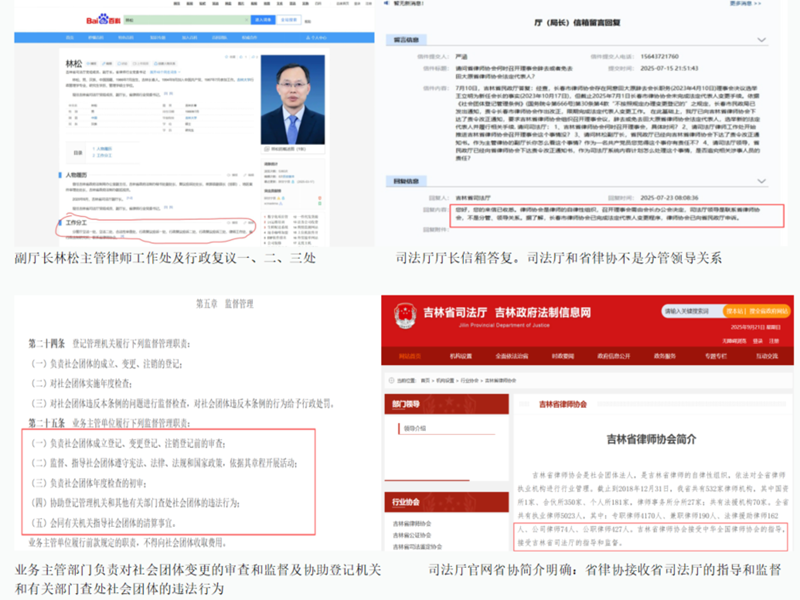 2023年4月,田大原在未卸任长春市律师协会会长的情况下,便被吉林省司法厅主管律师协会的副厅长林松推荐为省律师协会会长候选人,并“顺利”当选。副厅长林松在田大原未能提供由民政局委托的会计师事务所出具的离任审计报告的情况下,依然违法批准通过了其法定代表人身份的变更审核。这一明显的违规状态竟然持续了长达两年多的时间,直至 2025年7月10日,吉林省民政厅出具的《关于吉林省律师协会有关问题的答复》,明确指出:田大原同时担任省、市律师协会法定代表人,违反《社会团体登记管理条例》; 在此基础上,民政厅已向吉林省律师协会下达了《责令改正通知书》,要求吉林省律师协会组织召开理事会议,辞去或免去田大原省律师协会法定代表人,选举新的法定代表人并履行相关手续。